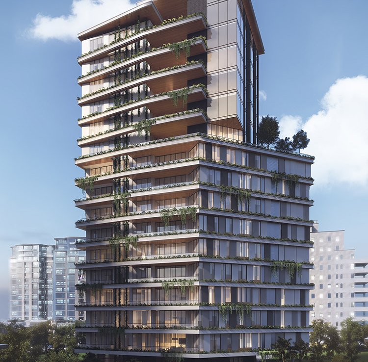 Su diseño de líneas simples y puras evocan un estilo contemporáneo, por medio del uso de balcones y fachadas de vidrio se genera movimiento en sus fachada a su vez otorgan luz a sus espacios interiores y espectaculares vistas a la ciudad.